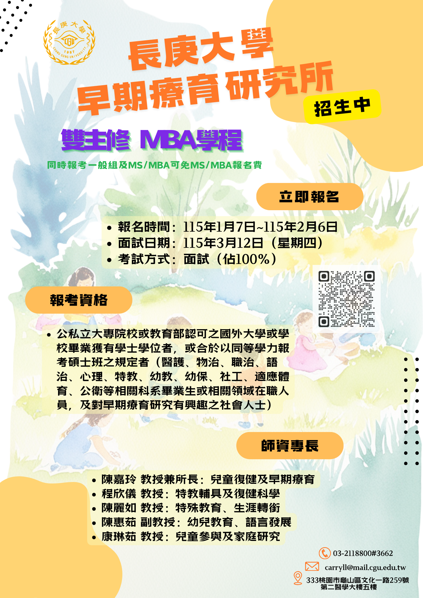 本會轉知 長庚大學早期療育研究所 辦理之 115學年度碩士班招生資訊。
